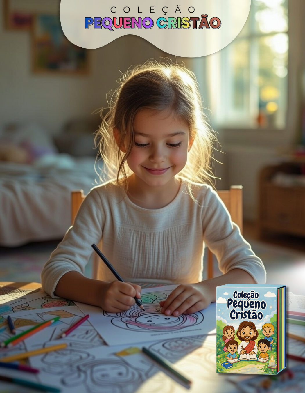 Seu filho aprende histórias bíblicas e valores cristãos colorindo, criando e se envolvendo, enquanto você ganha mais tranquilidade, menos telas e momentos significativos em família.